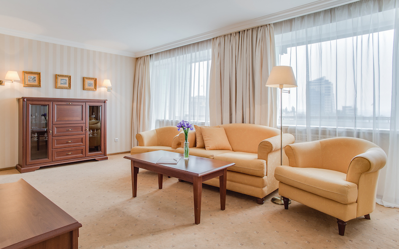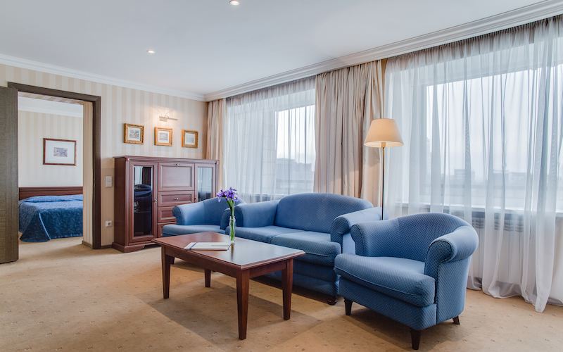 «Люкс» — это двухкомнатный номер площадью 50 м2. В номере предусмотрены: